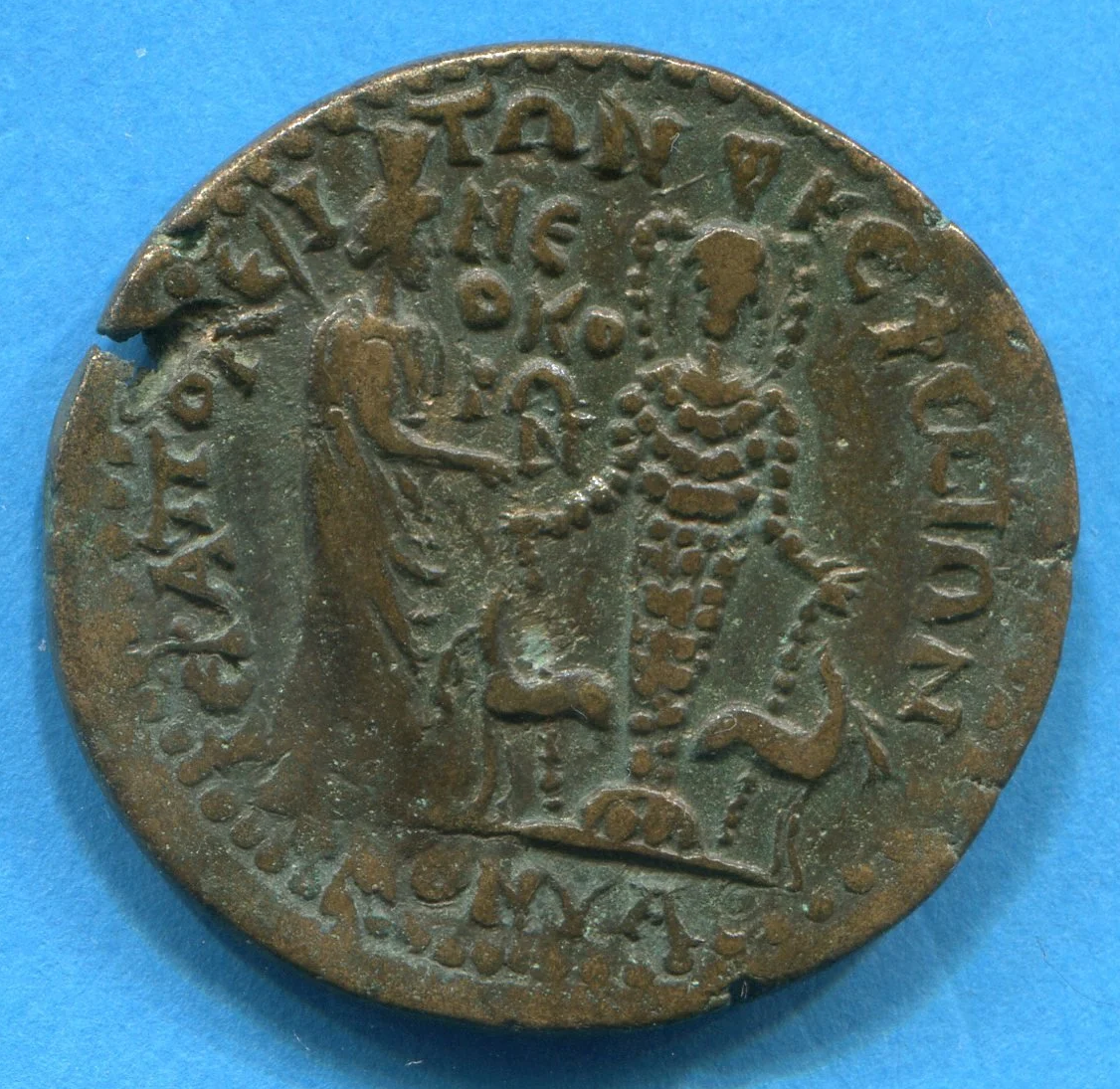 Рев.: ΙΕΡΑΠΟΛΕ - Ι – ΤΩΝ -Κ ΕΦΕϹΙΩΝ / ΝΕ / ΟΚΟ / ΡΩ / Ν / ΟΜΟΝΥΑ